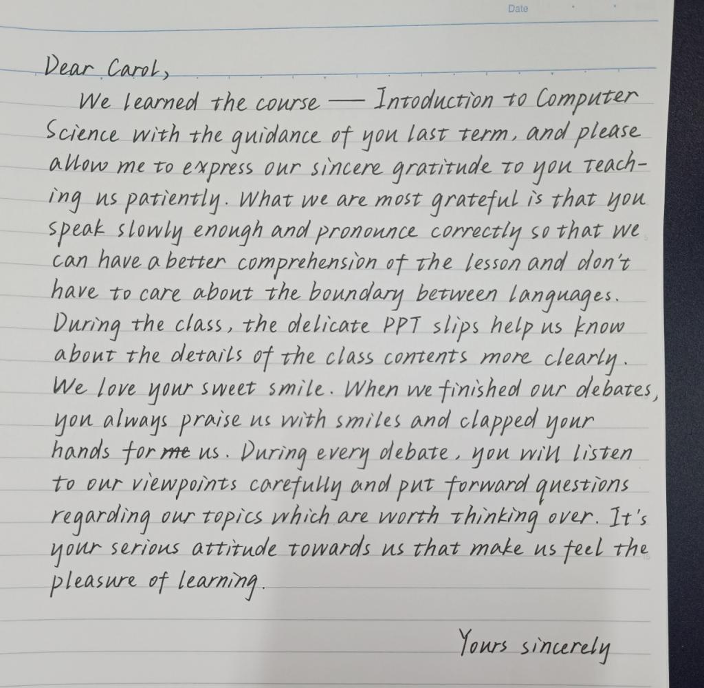 敬爱的Carol老师,感谢您带领我们走进神奇的计算机世界,让我们领略计算机领域的广泛、计算机技术对我们工作及生活的帮助;感谢您准确而清晰的英语发音,降低了语言障碍给我们带来的困难;感谢您制作精美的PPT以及丰富多彩的课程内容,让我们在轻松愉悦的课堂氛围中学习专业知识。我们最喜欢您甜美的微笑,当我们辩论结束时,您总是微笑着赞美我们,为我们鼓掌。在每一场辩论中,您都会仔细倾听我们的观点,并就我们的话题提出值得思考的问题。您认真的态度,让我们感受到学习的乐趣,让我们坚定了努力学习的信念。
