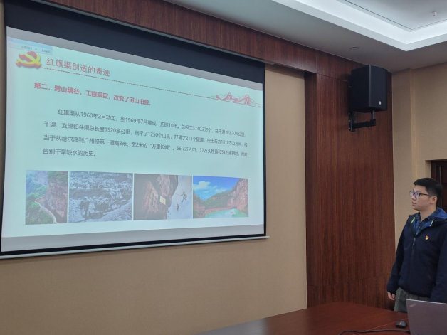 人工智能系党支部书记孙琨从红旗渠工程简介、创造的奇迹、精神内涵等方面,分享了学习红旗渠精神的体会。
